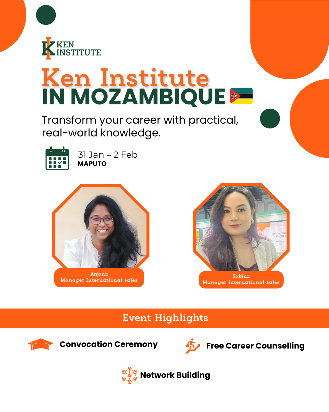Ken Institute is excited to bring personalized, in-person career counselling to Maputo, Mozambique. Meet our experts Anjana (Manager – International Sales) and Sabina (Manager – International Sales) and get guidance on educational pathways, international certifications, and industry-relevant courses.