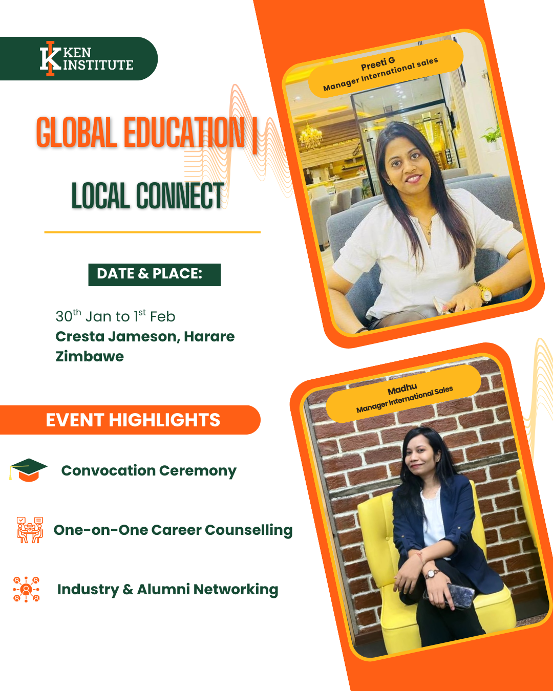 Ken Institute is excited to bring personalized, in-person career counselling to Cresta Jameson,Harare, Zimbabwe. Meet our experts Preeti G (Manager – International Sales) and Madhu (Manager – International Sales) and get guidance on educational pathways, international certifications, and industry-relevant courses.