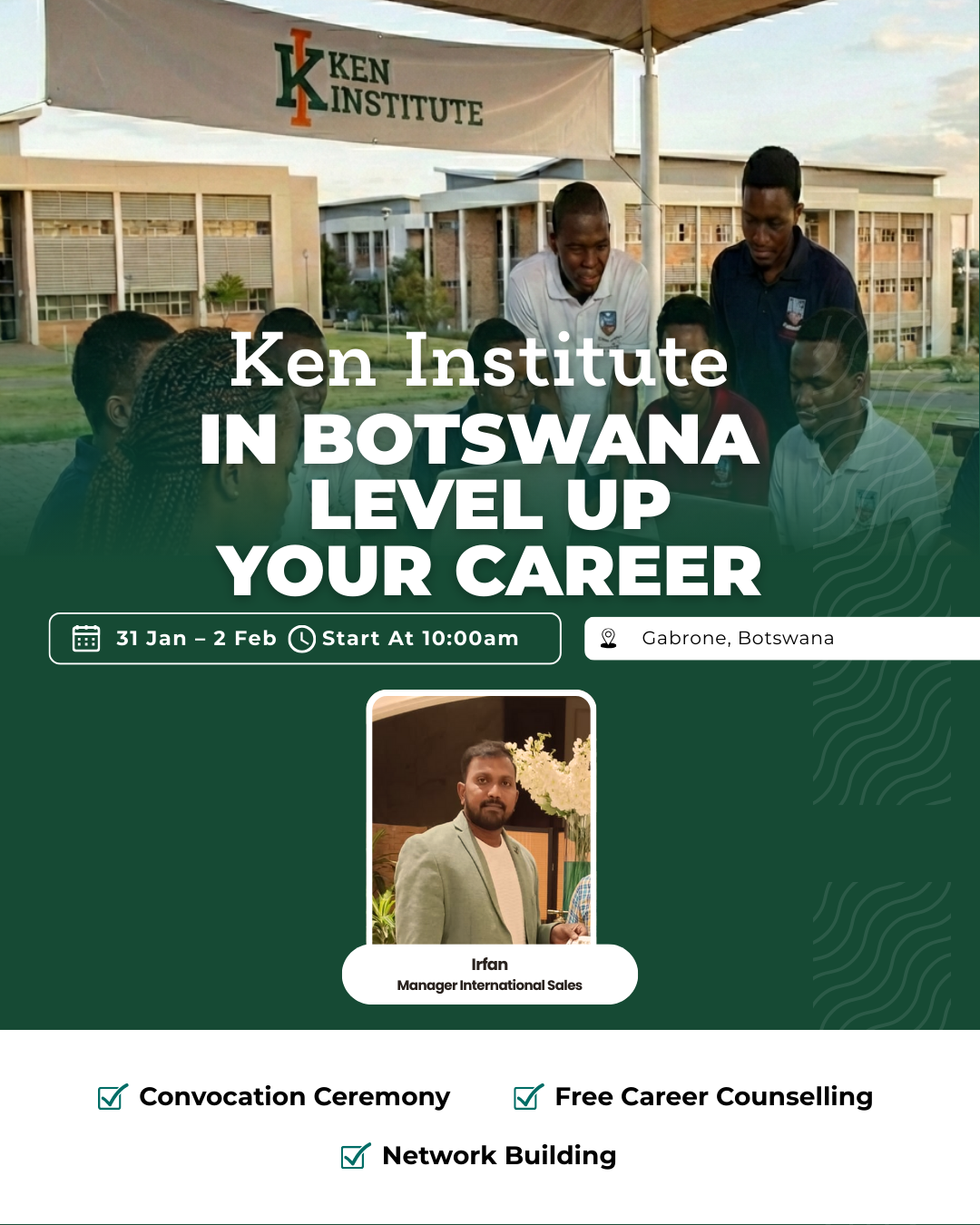 Ken Institute is excited to bring personalized, in-person career counselling to Gabrone, Botswana. Meet our expert Irfan (Manager – International Sales) get guidance on educational pathways, international certifications, and industry-relevant courses.