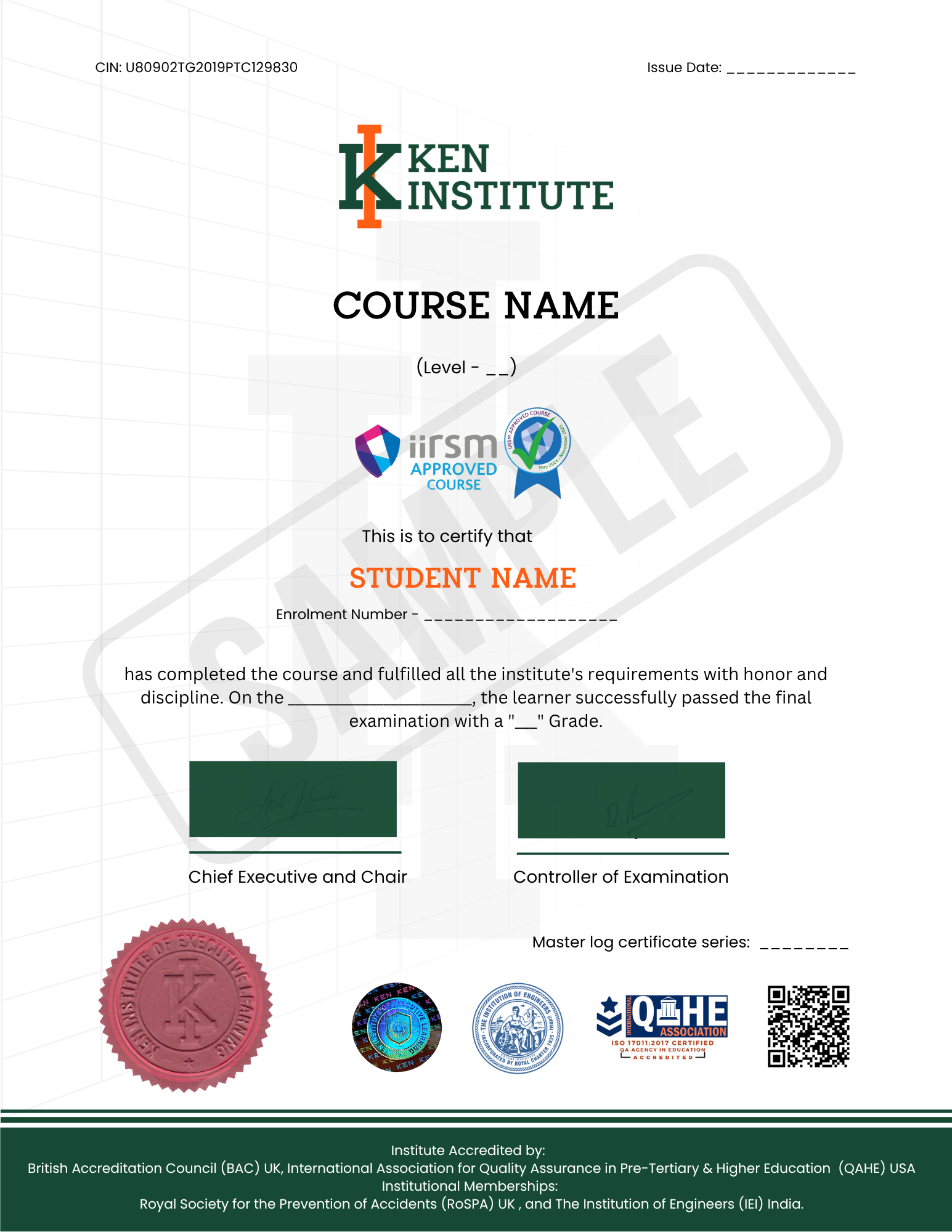 Ken Institute’s courses are accredited by the British Accreditation Council (BAC – UK) and the International Association for Quality Assurance in Pre-tertiary and Higher Education (QAHE). They are also approved by the International Institute of Risk & Safety Management (IIRSM – UK) and maintain memberships with the National Safety Council, RoSPA, and Institute of Engineers India.