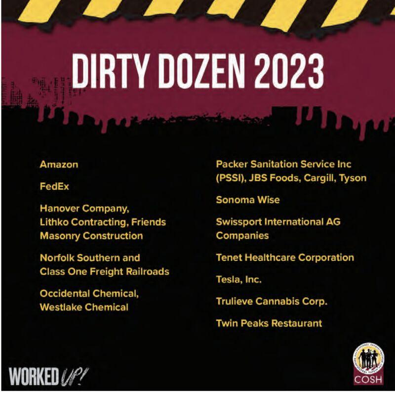 National COSH, which is composed of 26 grassroots worker groups, according to its website, announced the Dirty Dozen during Workers’ Memorial Week, a week to remember those who lost their lives on the job, and two days before Workers’ Memorial Day.